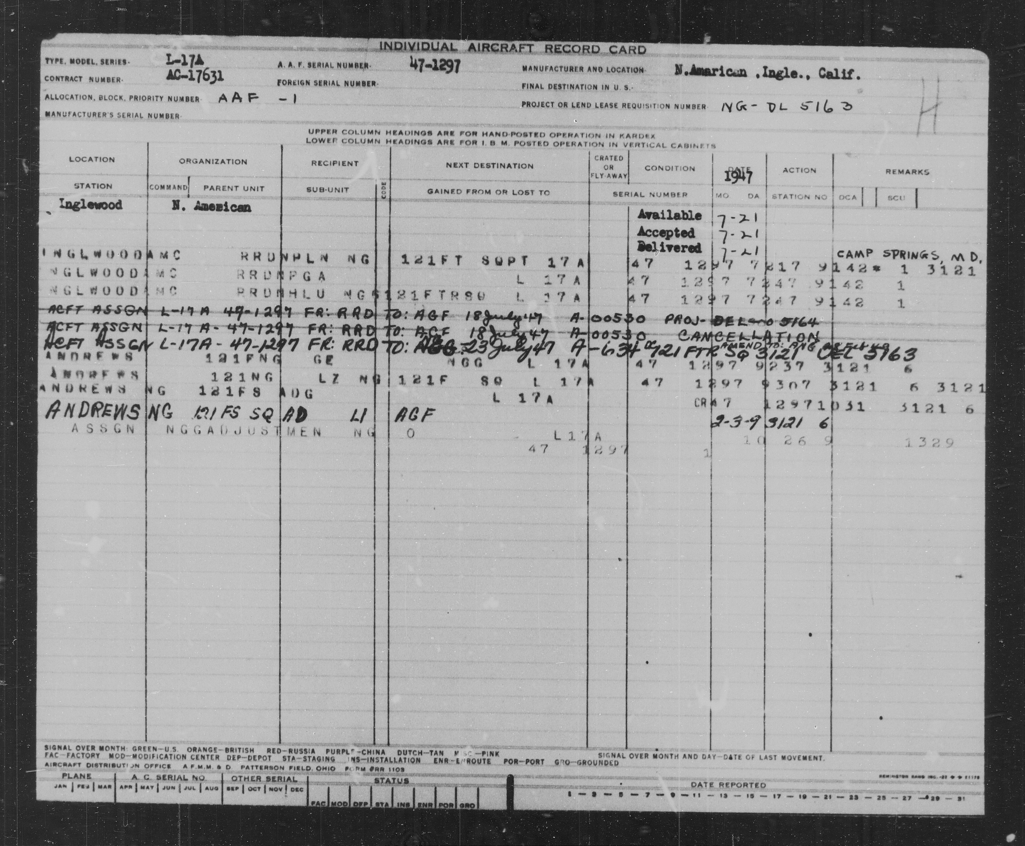 Note that North American L-17s were civilian aircraft fitted with paint and radios as needed to meet military requirements. Lore, documented by numerous direct references including Chan King, indicates that completed NAvion aircraft were pushed into a storage lot. When the USAF requested an L-17 delivery, a NAvion was pulled at random from the lot, painted, fitted, and flown off. This is reflected in the North Amercian Aviation Memo dated September 23, 1947 detailing the specific North American NAvion manufacturer's serial numbers that were used to fulfill the military contract. Review will show that the serial numbers are random rather than sequential (as they are with Ryan L-17Bs) indicating they were not built in a sequential lot